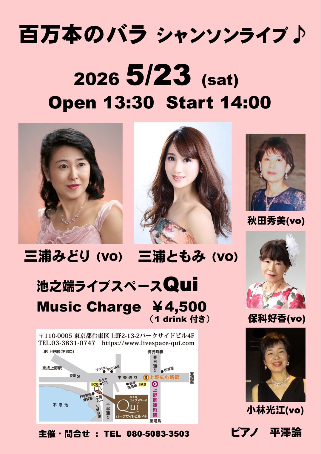 | 会場/池之端ライブスペースQui 東京都台東区上野2-13-2 パークサイドビル4F (1・2F 御蒲焼・旬菜料理 亀屋 一睡亭) TEL:03-3831-0747 開演時間/14:00~、受付/13:30~ 料金/4,500円(1ドリンク付)★要予約 出演/三浦みどり、三浦ともみ、秋田秀美、保科好香、小林光江、平澤諭(pf) |