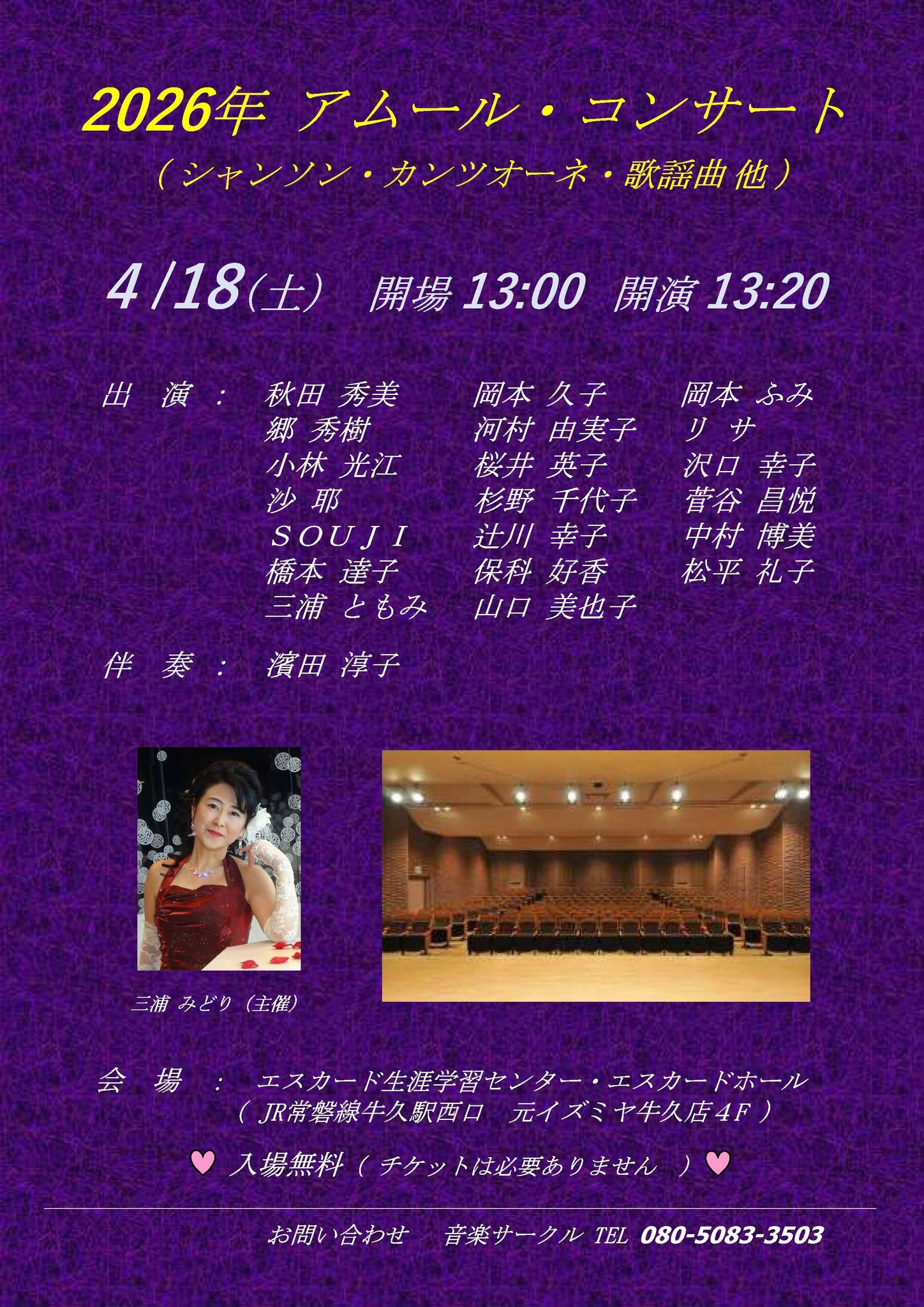 | 会場/牛久エスカードホール 茨城県牛久市牛久町280 (牛久駅西口駅前エスカード牛久4階) TEL:029-874-3131 開演時間/13:30~16:20、会場/13:00 入場料/無料 出演/三浦みどり、三浦ともみ、シャンソンを愛する皆様、濱田淳子(Pf)、平澤諭(pf) ゲスト/瀧澤行則 |